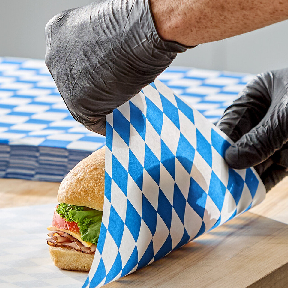 Featuring a bright blue check design, this Choice 15" x 15" blue check deli sandwich wrap paper brings a fun and exciting pattern that enhances your venue's personality. Use it to wrap sandwiches, burgers, hot dogs, and bratwursts, or line serving baskets with this playful paper.