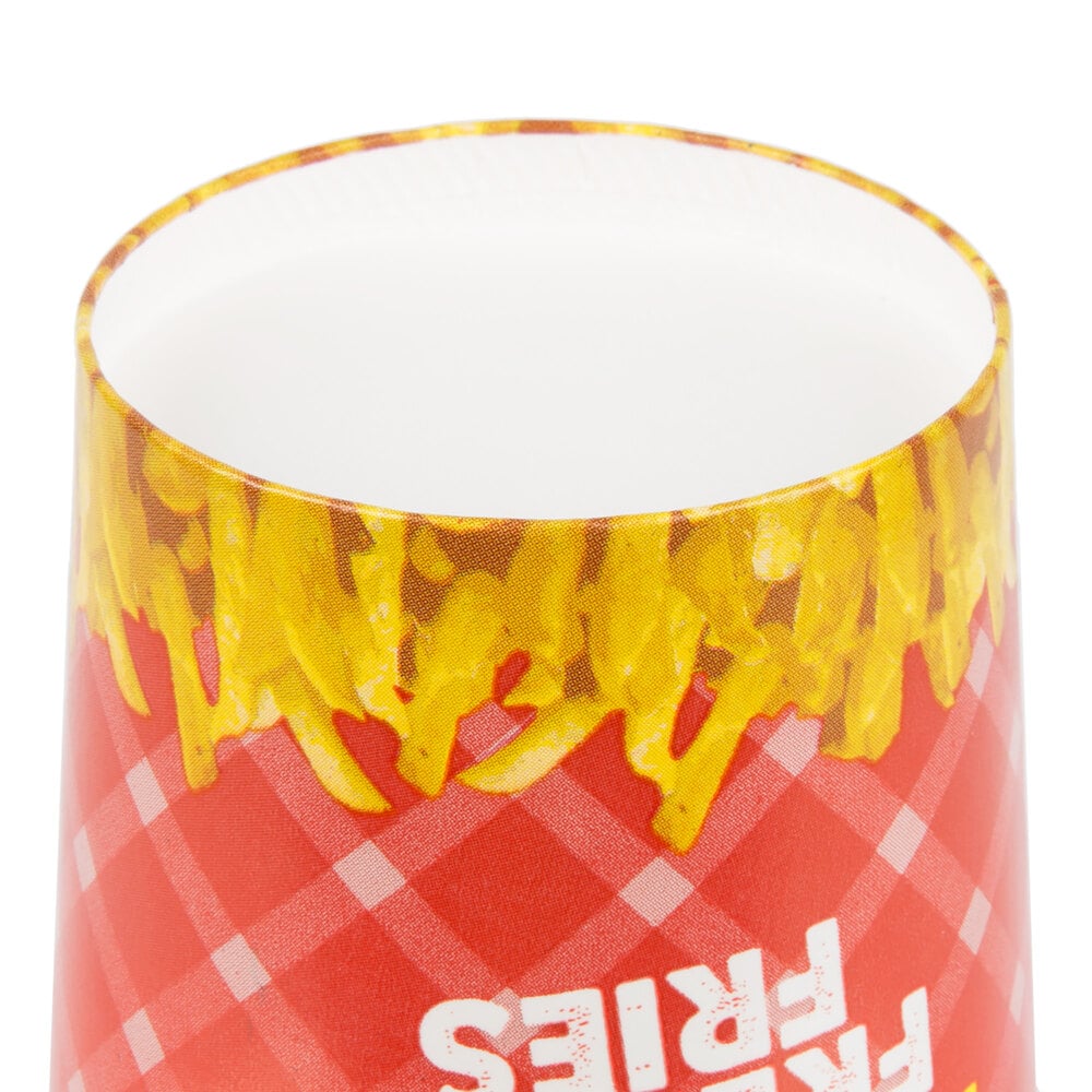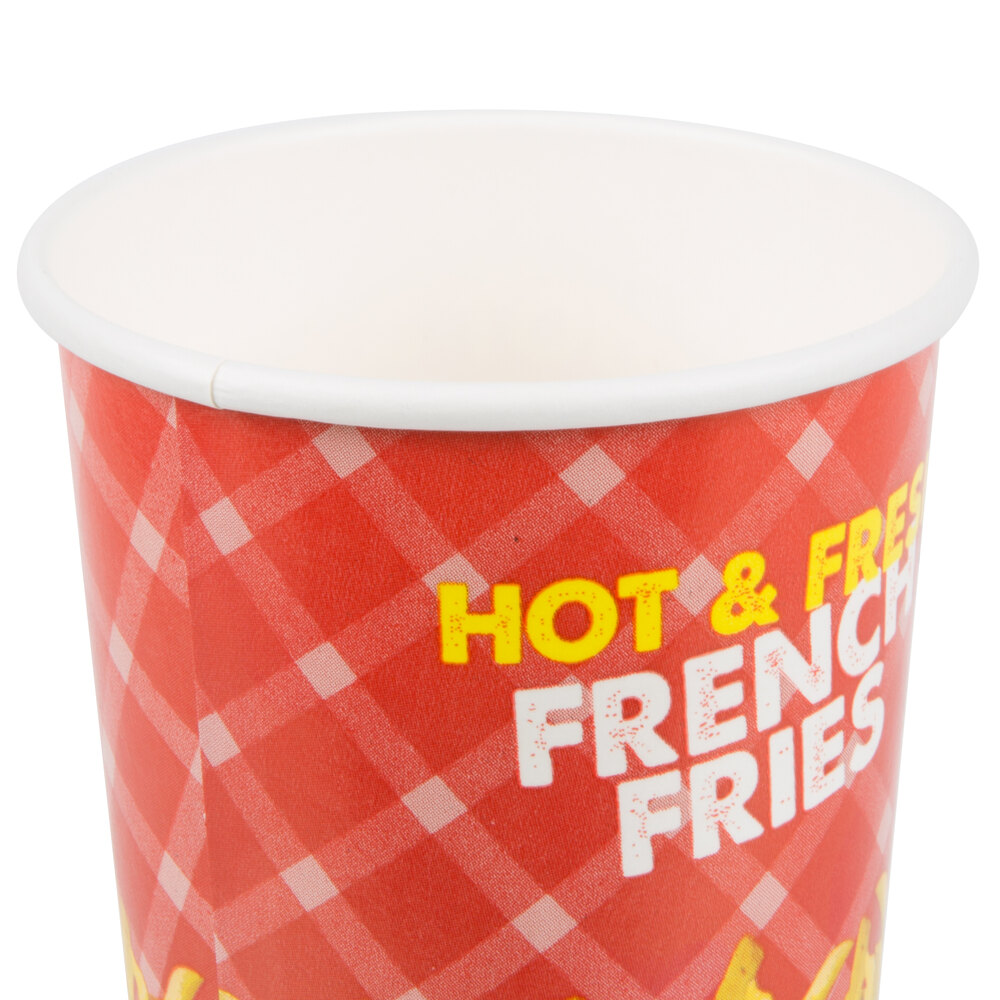 With its classic round shape and 12 oz. capacity, this Choice french fry cup makes an excellent addition to your fast food restaurant or stadium. Featuring a bold red background with eye-catching french fry graphics, this cup is a great way to display and serve your popular fries. For compact storage and quick retrieval, simply stack multiple cups!