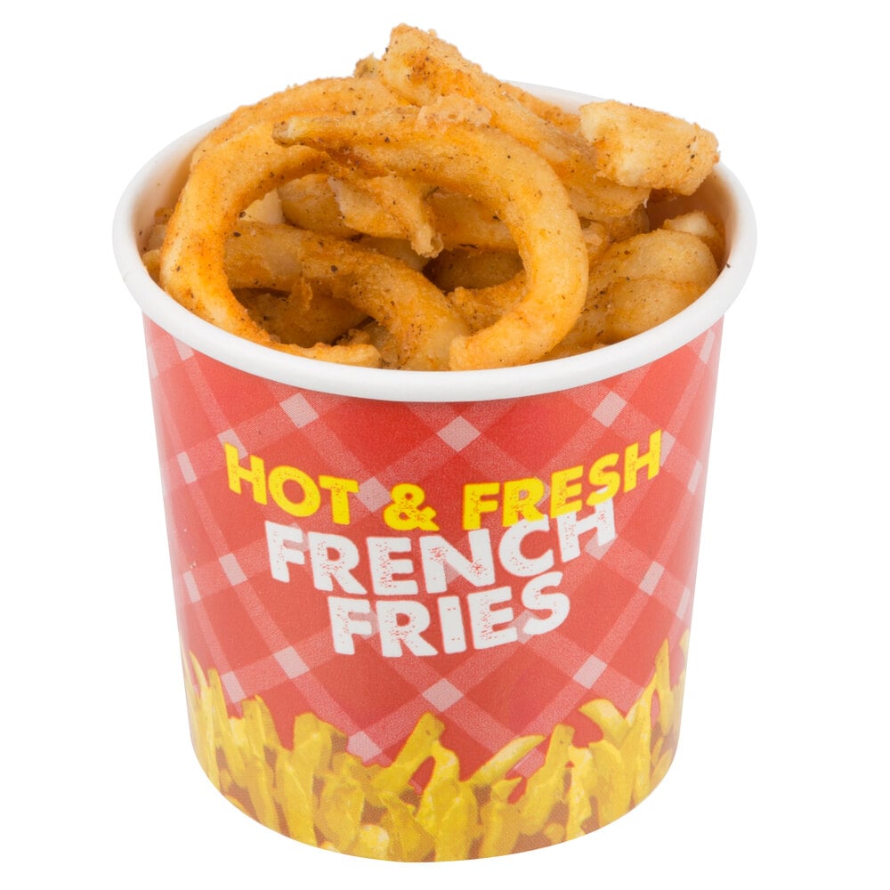 These heavy duty paper cups are very economical. The wide mouth makes filling them quickly a breeze, and they stand on their own preventing spillage. They hold 32 oz of fries, onion rings, or poppers and are easy for the customer to hold without getting greasy hands.