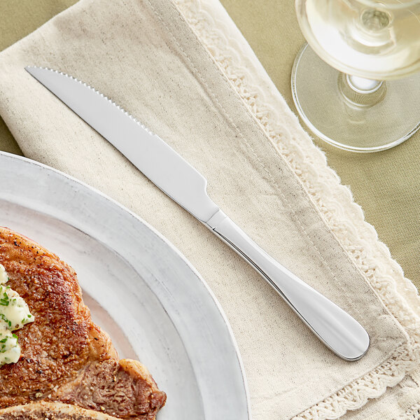 Acopa's Brigitte flatware collection blends traditional lines with built-to-last construction for appearance and dependability. Featuring a classic baguette design with a teardrop handle and a vertical ridge line for a contemporary look, this steak knife adds a touch of effortless elegance to your tabletop. It's suited to a variety of establishments and occasions, making this piece a versatile and timeless addition to your collection.