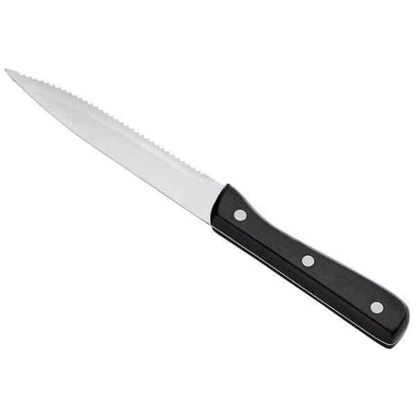This steak knife features a lightweight, riveted Bakelite handle. The handle's standard black color offers a classic look as well as the simplicity of matching any table setting. Choose this Choice knife to satisfy your budgetary requirements while providing your guests with an appealing and practical utensil.