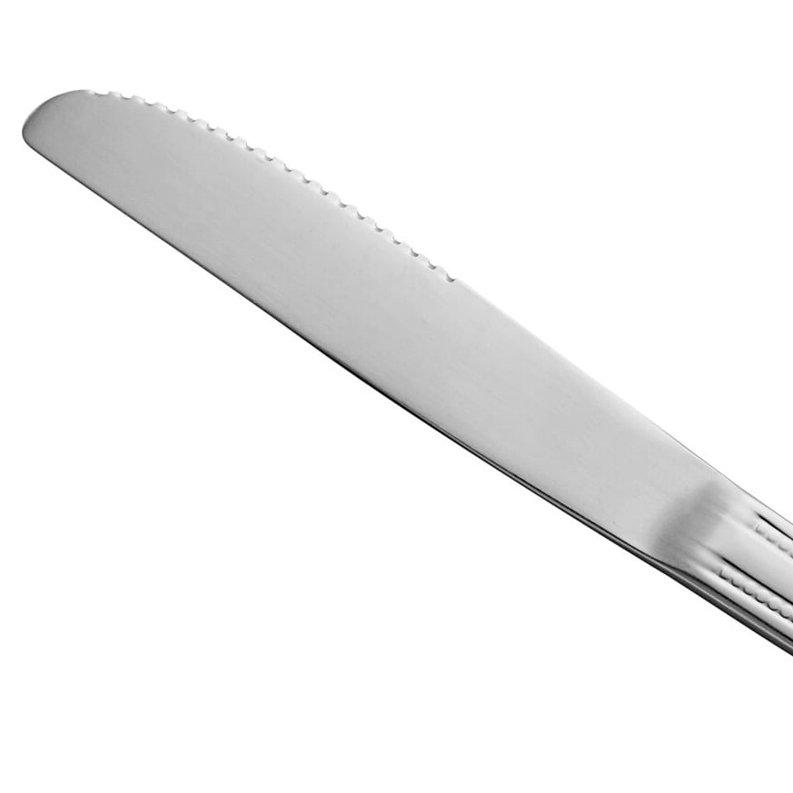 This dinner knife features a beaded edge and a subtle design that doesn't feel out of place in a casual dining atmosphere. Its polished finish offers a clean appearance, and it is very much at home in your family restaurant, bar and grill, or cafe.