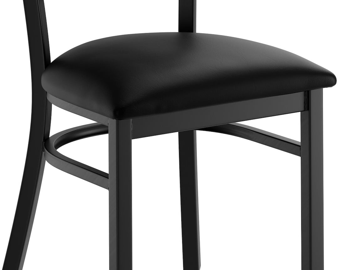 The 2 1/2" thick black vinyl padded seat provides exceptional comfort for your guests, and it's also durable and easy to clean! It is made with fire-retardant foam for added safety.