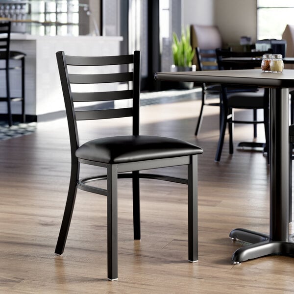 Seat your guests in comfort and style with this Lancaster Table & Seating black finish ladder back chair with 2 1/2" black vinyl padded seat.