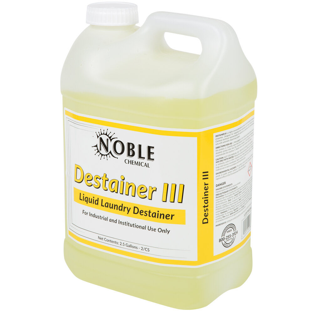 Noble's Destainer III liquid laundry destainer features a highly-concentrated chlorine bleach formula designed to clean even your dirtiest laundry. This product is enhanced with whitening and stain removal properties and can bring the white color back to your aprons, towels, and uniforms. Destainer III is designed for use in industrial and institutional settings and is the perfect choice for any high-volume establishment.