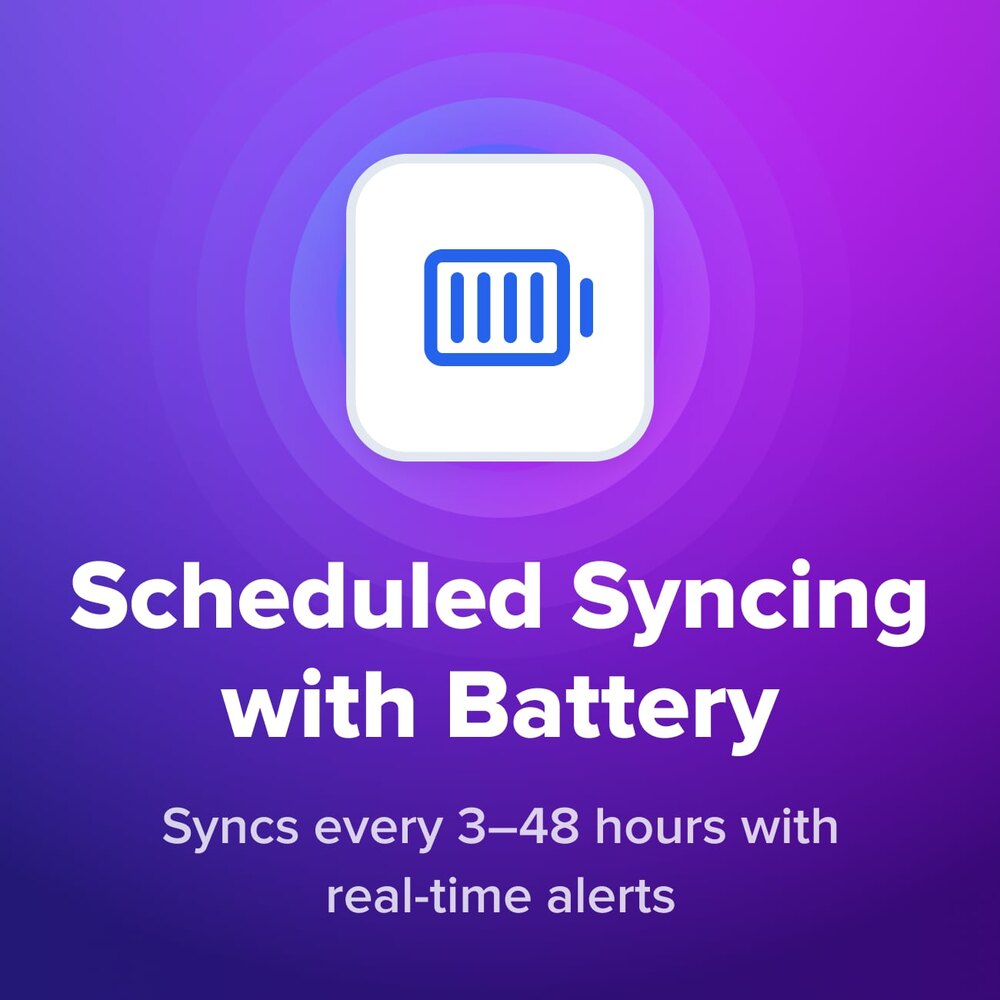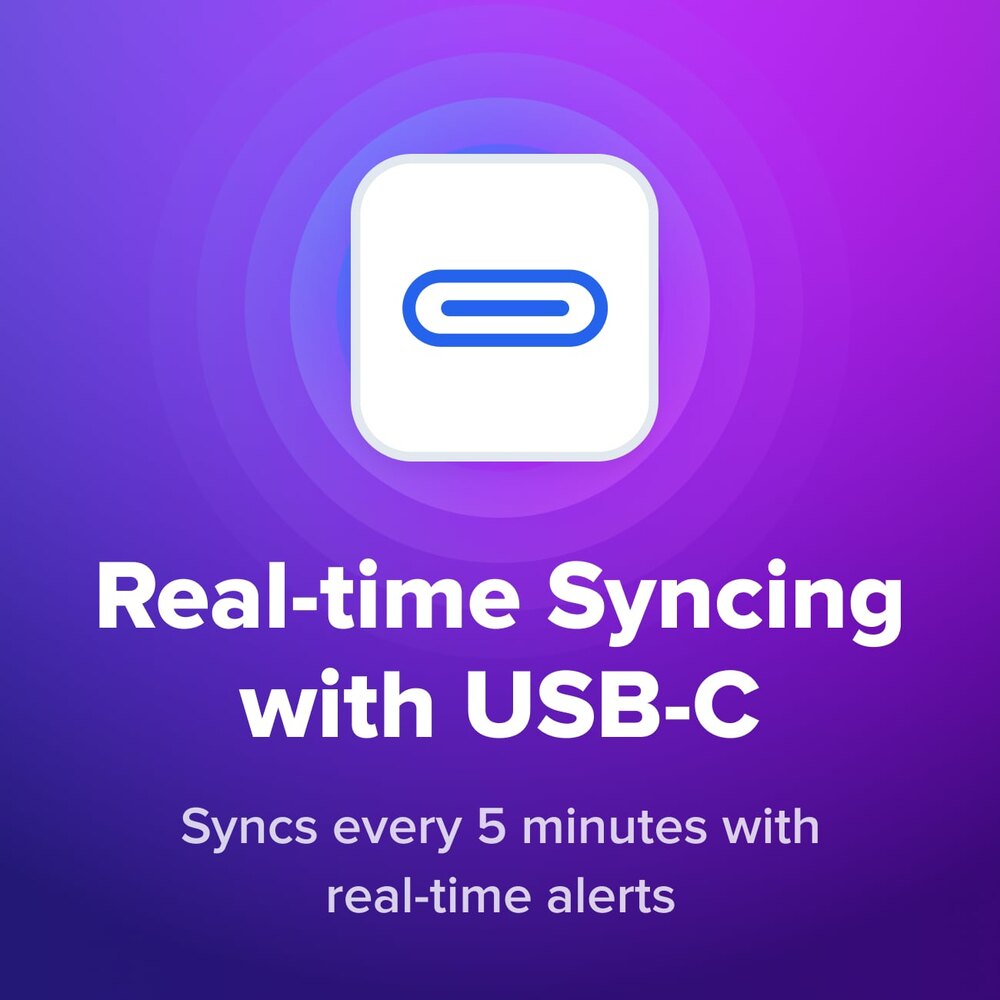 - Scheduled syncing via AA batteries (two included) or real-time syncing via USB-C cord (not included)