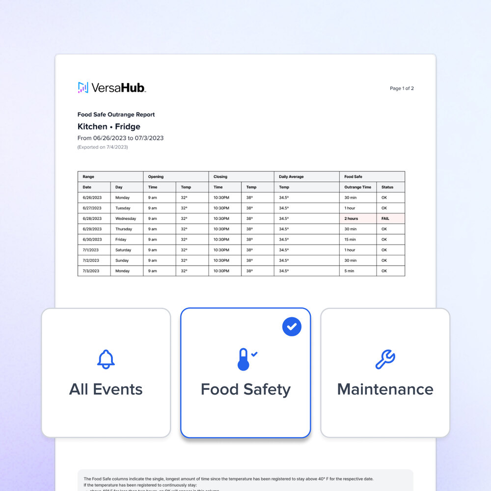 Adhere to regulatory standards, prevent losses, and gain a comprehensive overview of operations by downloading logs for HACCP compliance, equipment events, and maintenance. Upgrade to VersaHub Premium for a year-long report history, enhancing insight and providing peace of mind.