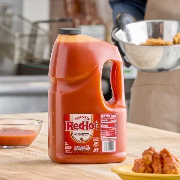 Frank's RedHot sauce delivers balanced flavor and heat with a premium blend of five simple ingredients. High in demand, make sure to stock up and have enough hot sauce for all of your dishes with this 1 gallon container! Its convenient handle and resealable cap make it easy to transport, store, and even dispense into smaller bottles for table service so your patrons can add just the right amount to their foods. Hot, spicy, and delivering flavor that will tempt your customers back for more, Frank's RedHot original hot sauce is a top choice full of authentic flavor!