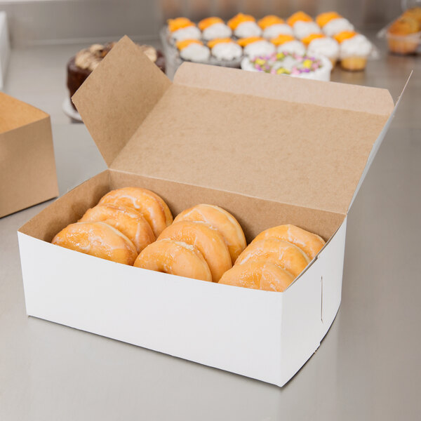Entice your customers into taking home your delicious cookies or muffins with this white cake / bakery box. The one piece design allows the lid to be opened easily and then tucked back into place to secure the contents. Make sure your bakery is complete by providing a durable cake box for your customers!