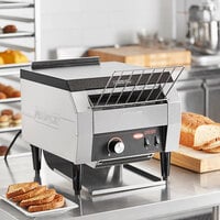 Commercial toasters produce large quantities of toasted bread quickly and efficiently. Our selection of commercial toasters includes models from popular manufacturers that accommodate standard size bread or bagel sizes. Conveyor toasters are perfect in areas where high-volume use is common, like college dining halls and breakfast buffets, or behind the counter in a bakery, bagel shop, cafe, coffee shop, or deli!