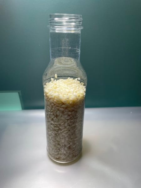 I use this 12 oz neck sauce bottle for rice. Its long neck makes it easy to pour smaller amounts out. It’s made of sturdy plastic and the top I bought for it screws in smoothly.