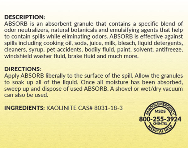 Absorb odor neutralizer and spill stabilizer is perfect for cleaning up bodily fluids, cooking oils, drinks, paints, automotive chemicals, solvents, pet accidents, and much more.