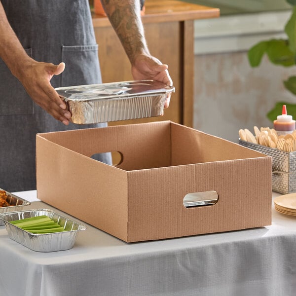 We needed a box to load up our disposable pans of food for pickup catering orders. Very pleased with this box. It's the right size to fit up to three full size pans of food, even with a touch of space to spare. Highly recommend!