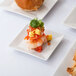 For a trendy departure from traditional dinnerware, serve foods on this stunning 3" bright white square plate. This plate features a durable porcelain construction for long-lasting use and a bright white color that provides eye-catching contrast with your delicious offerings. Its unique square design combines style and functionality with sides that curve slightly upward to prevent spills. This 3" square plate is perfect for serving appetizers, bread and butter, side dishes, or desserts at your bar, restaurant, hotel, or catered event.