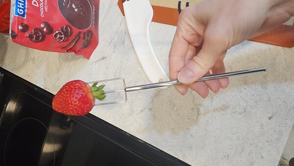 I did not know what I was missing until I saw this awesome little fork on Webstaurant. I usually make a batch of chocolate covered strawberries every year, and I usually struggle coat the berrries without coating my fingers (don't come at me, the berries are just for my husband and I!). Well, no longer. This handy-dandy fork spears your larger berries or apples just right, so you can twist and twirl them through your pot of chocolate til they're evenly coated without worrying that the leaves are going to fall off. The fork has very sharp tines, so you will want to place your fruit/marshmellows on a cutting board to spear them (and not all the way through either)......don't try to hold the fruit in your hand to spear.....trust me on this. Overall, it was a joy to use, and I could see myself buying a few more for fondu. I really like that they are stainless steel and be chucked into the dishwasher.....I mean....not chucked, but lovingly placed into your flatware caddy. These are delightful; you won't be disappointed.