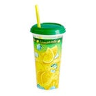 Enhance the value of your concession stand's lemonade and enchant guests of all ages with this 32 oz. tall plastic lemonade souvenir cup with a straw and lid! This eye-catching cup featuring bright yellow and green graphics also includes a lid and straw to reduce spillage and add to the decorative design of the cup. Its durable plastic material allows you to wash and reuse as a souvenir item. Hold up to 32 oz. of refreshingly sweet lemonade in this unique cup that brings amusement to any setting or occasion!