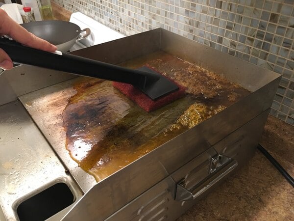 Easiest Griddle cleaning system I have used. 3M 405-R Scotch-Brite 16" Multi-Purpose Pad Holder for use with 3M 746 Scotch-Brite 4" x 5 1/4" Quick Clean Heavy-Duty Griddle Pad. Don't forget 3M 700CC Scotch-Brite 3.2 oz. Liquid Griddle Quick Clean Packet.