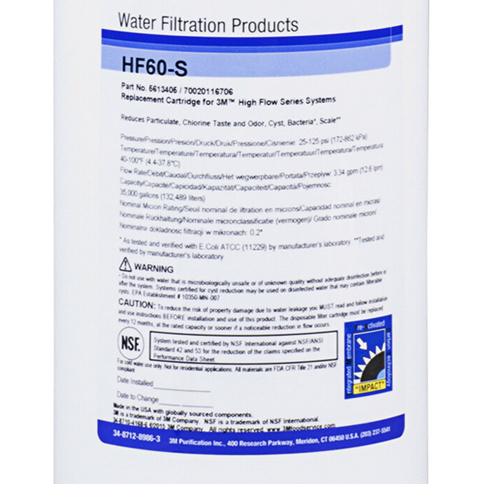 3M Water Filtration Products HF60-S Replacement Cartridge for ICE160-S Water Filtration System - 0.2 Micron and 3.34 GPM