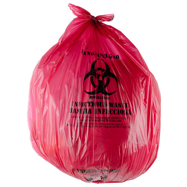 Sir Clean recommend this product 10 Gallon 24" X 24" Red Isolation Infectious Waste Bag / Biohazard Bag Linear Low Density 1.2 Mil - 250/Case, it's perfect to use in hospitals, laboratory etc. The description is in Spanish and English.