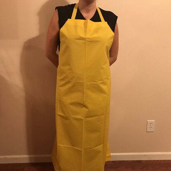 The 47" x 35" Yellow PVC / Polyester Dishwashing / General Use Apron gets the job done. Ive had it for about 3 months now and its still trucking. Worth the money