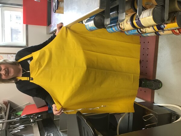 This is a great cheap utility apron, we not only use on the wet line for dishes, but use at weeks end for deep cleaning and scrubbing floors.