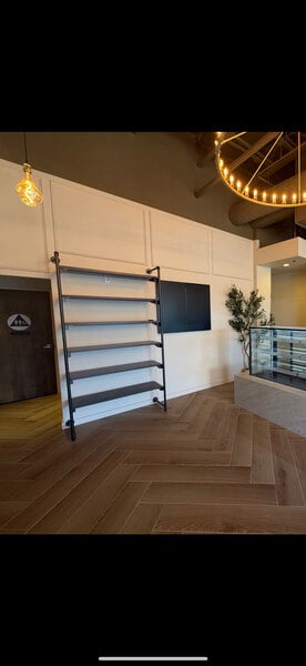 This outrigger kit is versatile and adjustable. The shelves and bottom mount can be vertically adjusted to better suit the merchandise and surroundings. The wall mount is constructed from 1 1/4" diameter plumbing pipe. Its anthracite gray finish is subtle and looks great. This kit includes two outrigger uprights, six black shelves, and twelve shelf brackets.
