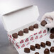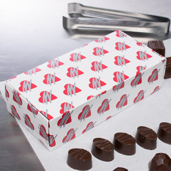 Whether you are packaging and selling taffy, fudge, or indulgent chocolates, this box is sure to do the trick! Covered in a pattern of beautiful hearts, this box is great for gifting sweet treats on all love-related occasions, but really pops for those romantic gestures of the Valentine season. Capable of holding up to a 1/2 lb. of your decadent desserts, the SBS paperboard construction is sturdy enough to ensure your product is well protected. Combine with specialty bows or custom labels for a unique, personal touch. Perfect for your bakery, candy shop, or restaurant, its pristine appearance is sure to catch everyone's attention.