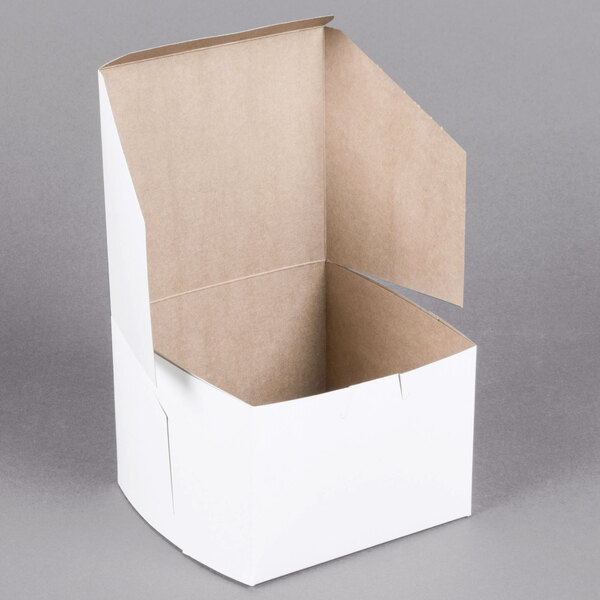 Entice your customers into taking home your delicious cupcakes, cookies, or muffins with this 5 1/2" x 5 1/2" x 4" white cake / bakery box. The one piece design allows the lid to be opened easily and then tucked back into place to secure the contents. Make sure your bakery is complete by providing a durable cake box for your customers!