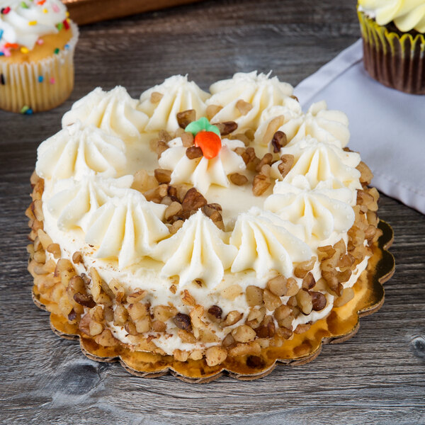 Whether serving or packaging a cake, the presentation is almost as important as how the cake tastes. This product features a decorative gold coloring that ensures your creations stand out for a stunning appearance. Plus, it is made of sturdy, single-wall corrugated cardboard to provide ample support for even the heaviest of cakes.