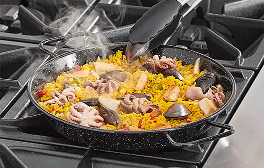 Paella pans are wide and shallow, making them the perfect solution for frying fish and other types of seafood to reach the right texture and consistency.