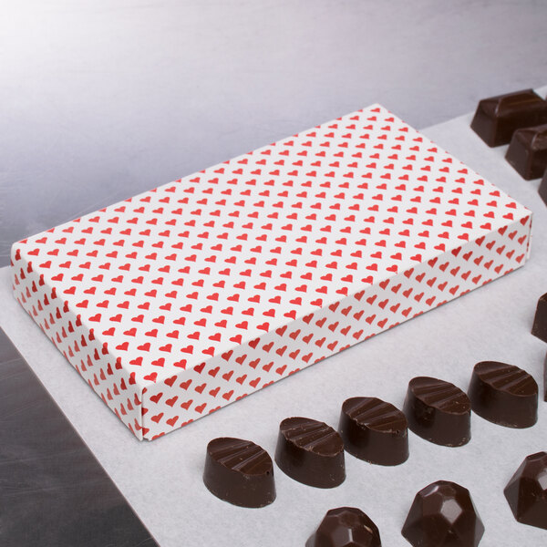 Love is in the air! Encourage patrons to celebrate romantic occasions year-round with this Simplex 7 3/8" x 4" x 1 1/8" 2-piece 1/2 lb. Valentine's Day heart candy box. Covered in little red hearts, this box screams 'I love you!' It's the perfect box for patrons giving sweet treats as anniversary or bridal gifts, as well as those surprising their partner with baked goods. Your bakery, candy shop, or restaurant can use this decorated box to package fudge, taffy, cookies, candies, and mints. This embellished box is sure to catch everyone's attention and increase impulse buys at your business!
