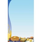 The left insert has orange juice being poured into a cup along the left side with a short stack of pancakes, toast, eggs, and crispy bacon lining the bottom edge. The insert can be easily fed through any copier or printer so that you can quickly and easily print your menu and catch the essence of early morning dining!