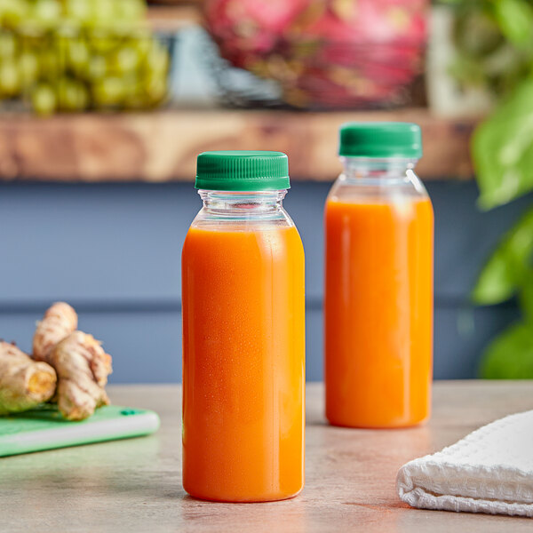 Package and sell your signature juice or beverages with this Captiva Containers 8 oz. Round PET clear bottle with green lid. Made of recyclable PET plastic, this bottle features a round shape that allows you to maximize your storage and display space. Its crystal-clear construction helps showcase your products, and it comes unbranded and unlabeled, allowing you to easily add your own custom label, brand, logo, or nutrition information. Use it to individually bottle fresh-pressed juice, iced coffee, or tea for sale.