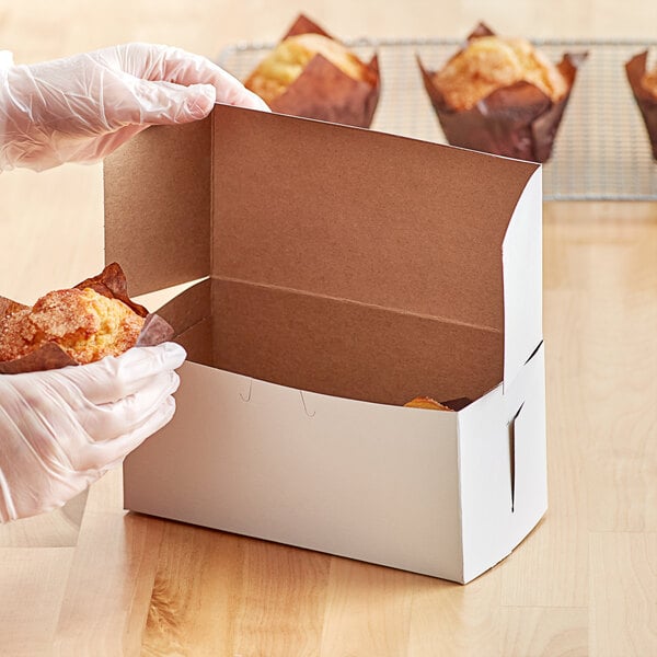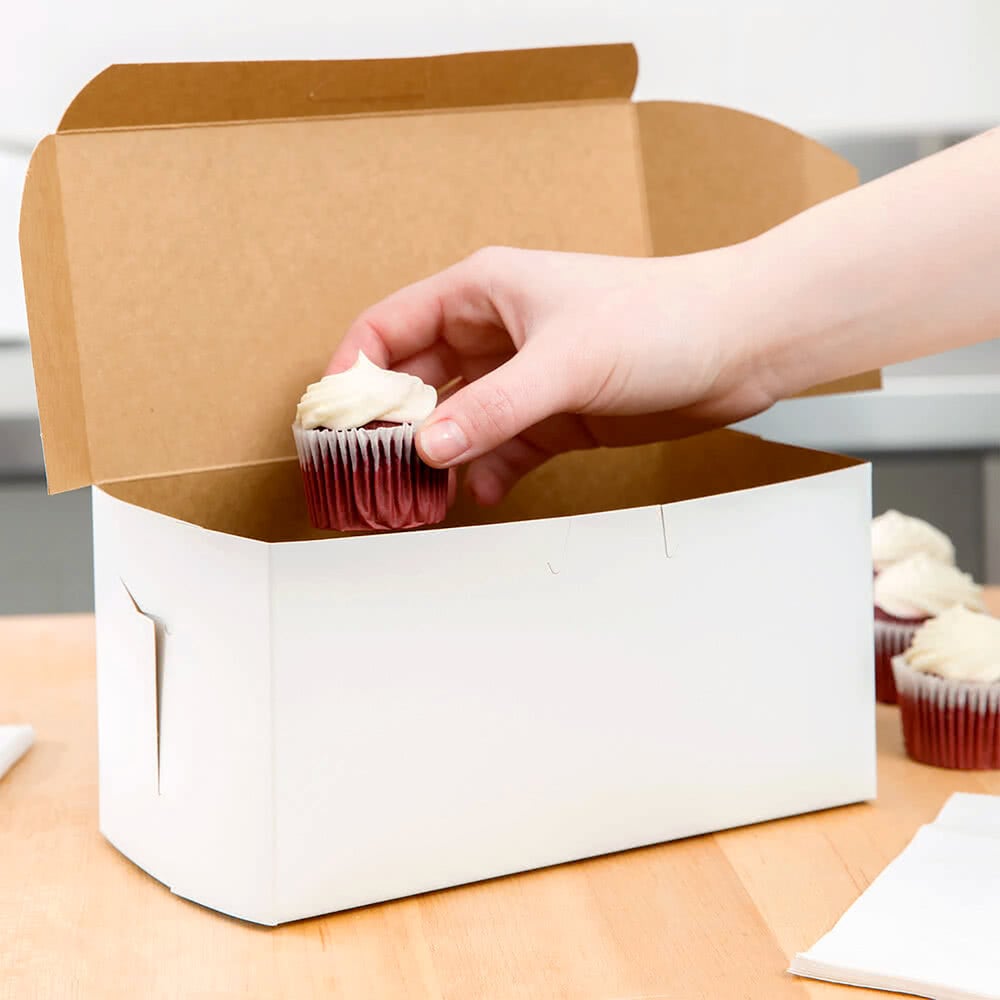Entice your customers into taking home your delicious cupcakes, cookies, or muffins with this 8" x 4" x 4" white cake / bakery box. The one piece design allows the lid to be opened easily and then tucked back into place to secure the contents. Make sure your bakery is complete by providing a durable cake box for your customers!