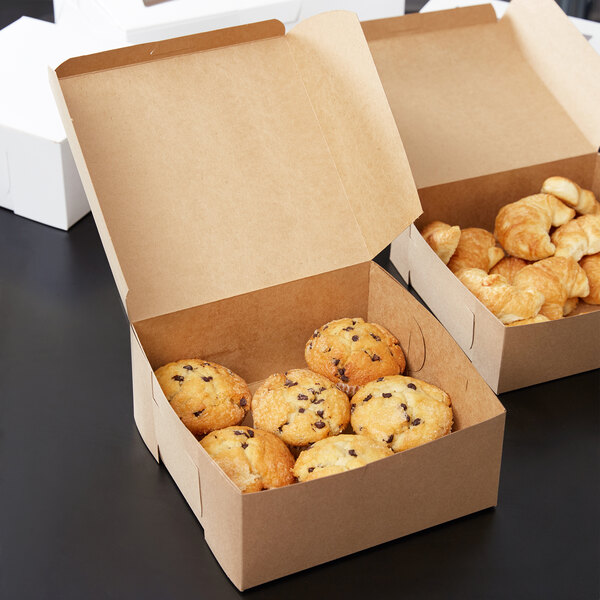 Add an eco-friendly edge to your decadent dessert service with this 8" x 8" x 4" kraft cake / bakery box.