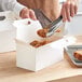 Offer your signature to-go options all in one convenient box with this 9 1/2" x 5" x 5" white barn take-out box! This take-out box is perfect for restaurants, cafes, delis, and caterers. The white design on the exterior compliments any eatery and allows for endless options of what goes in the box. Piping hot fried chicken and french fries easily go from deli counter to end destination in this box. Cold sandwiches, sides, and even baked goods travel well, too!