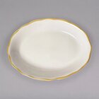 Treat your guests to an elegant meal using this CAC 9 5/8" x 7 1/8" ivory (American White) scalloped edge china platter with black band! This platter is made of durable china in order to ensure longevity in the high-pressure demands of any commercial kitchen. Its rimmed design will keep your food protected and prevent any sauces or gravies from dripping over the side. Not only is the rim great for keeping your dishes sanitary, It features a scalloped design that will add an elegant touch to your table setting. This platter's attractive ivory color will provide a contrast to your meals that will allow them to pop right off the plate! Additionally, the platter band embellishes your presentations, creating a frame for your dish.