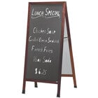 Banish bland advertising with this Aarco MLA1B 68" x 30" cherry wood a-frame sidewalk board with black composition chalk board! Designed for both indoor and outdoor use, this double-sided a-frame board is the perfect addition to your restaurant, bar, coffee house, or diner. Simply use bright, colorful chalk or chalk markers to highlight menu specials, promote upcoming entertainment, or post important messages for both customers and staff alike. To quickly change the display, the board's smooth surfaces can easily be cleaned with either a blackboard eraser or damp cloth.