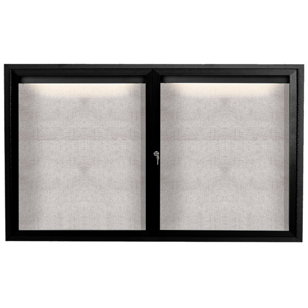 Display important information at hotels, offices, schools, hospitals, or restaurants with this Aarco ODCC3660RIBK 36" x 60" 2 door powder coated black outdoor lighted bulletin board cabinet. This message board features a burlap weave vinyl surface interior that thumb tacks will readily sink into to hold important messages for your clients, students, or guests. Simply hang up bulletins or flyers to create and present menus, announcements, or schedules. Additionally, this lighted cabinet has LED light fixtures and a light deflector to illuminate your messages for easy reading. Once your message is ready, you can easily close the hinged acrylic safety doors and lock them to prevent tampering.