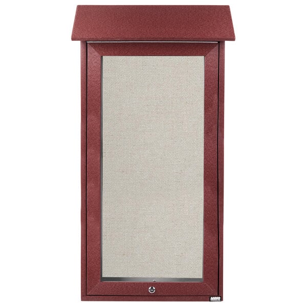 Display important information in any environment with this Aarco OPLD3416-7 Slimline 34" x 16" rosewood outdoor locking plastic lumber message center with vinyl coverd cork tackboard! Built to last, this message board is made from a durable plastic lumber that mimics the attractive qualities of real stained wood! Weatherproofed to withstand the elements, this message center is perfect for communicating daily specials outside of your cafe or holiday events outside of your school or church.