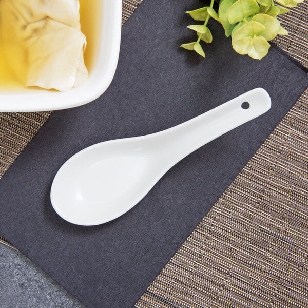 This spoon features a timeless, porcelain construction. This gives it a polished, professional feel perfect for your upscale Asian bistro, restaurant, or catered event.