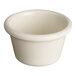 This ramekin is made of a break-resistant melamine construction, allowing it to withstand daily use in commercial kitchens and dining rooms. Its elegant, smooth sides and bone white color enhance the pattern and color of table linens, dinnerware accessories, and table settings. It also provides superior contrast, making your offerings seemingly pop off the table for an attention-grabbing appearance.