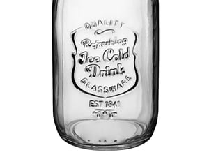 This bottle features an old-fashioned milk bottle silhouette with the stylish decorative message "Refreshing Ice Cold Drink" embossed onto the front.