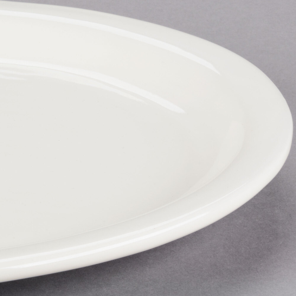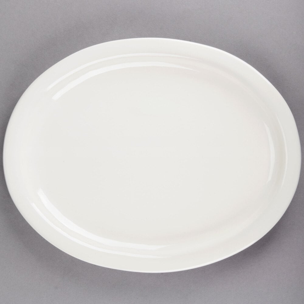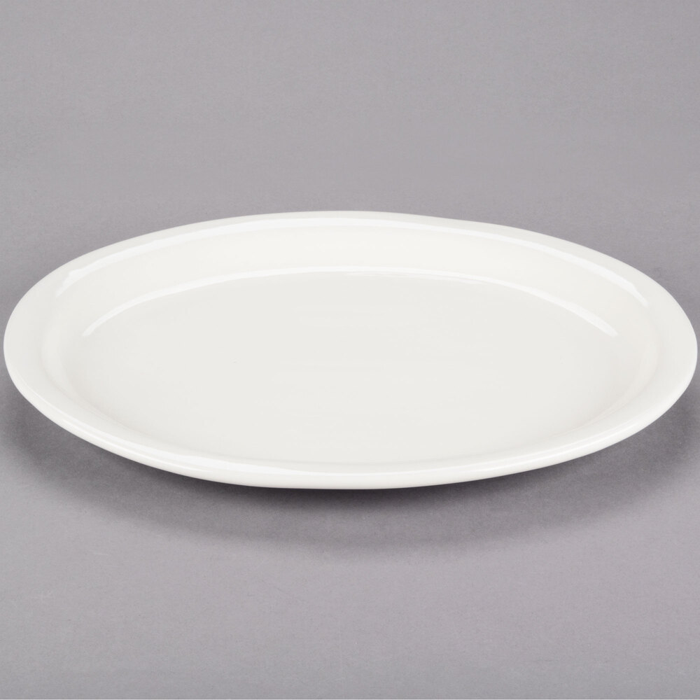 These 13 1/2 x 10 1/2 inch Ivory (American White) Narrow Rim Oval China Platter-12/case look great and are built to last. Will order again.