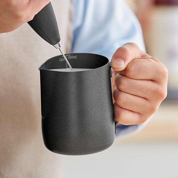 Quickly steam milk for your smooth and creamy lattes and cappuccinos with this Acopa 12 oz. black frothing pitcher with measuring lines!
