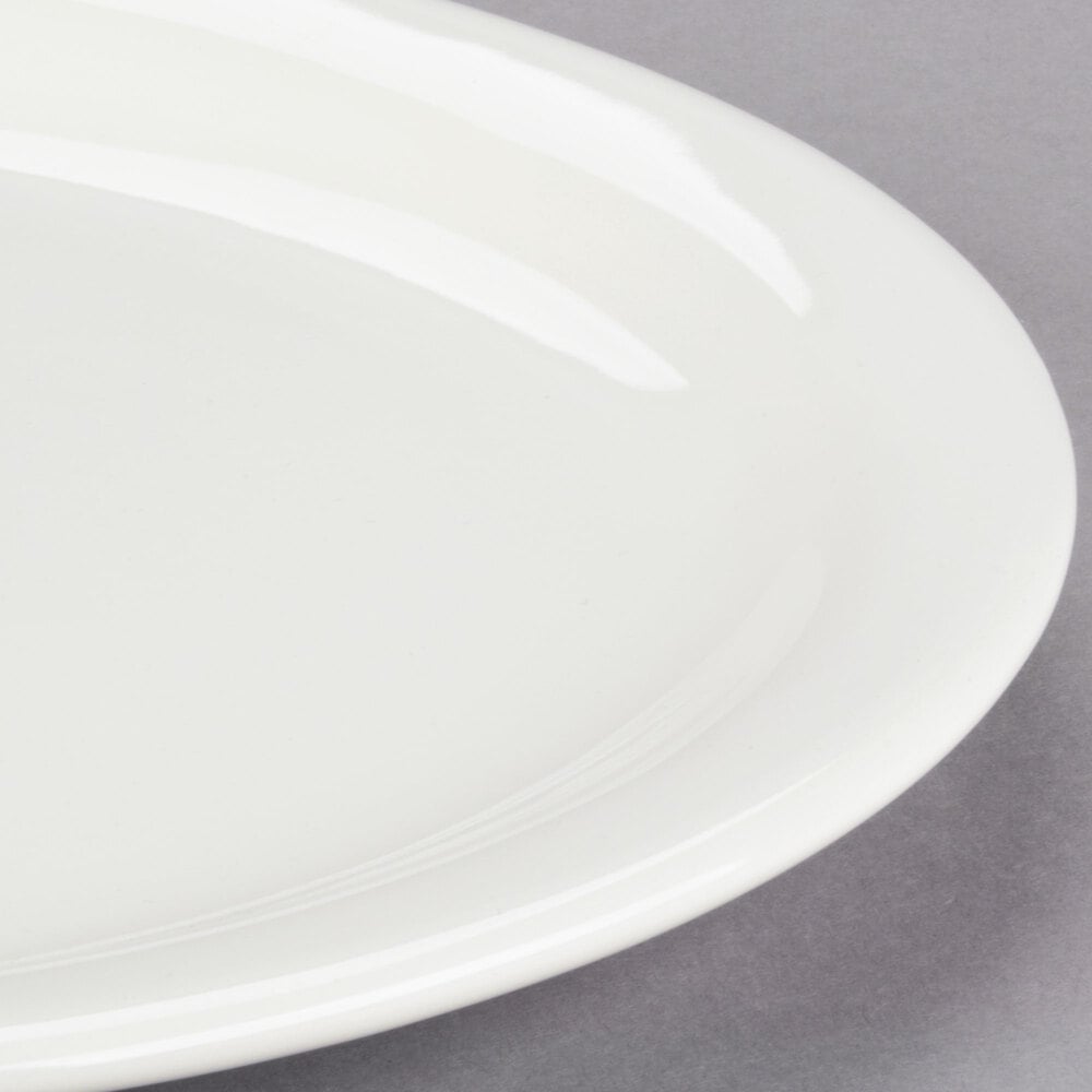 These 13 1/2 x 10 1/2 inch Ivory (American White) Narrow Rim Oval China Platter-12/case look great and are built to last. Will order again.