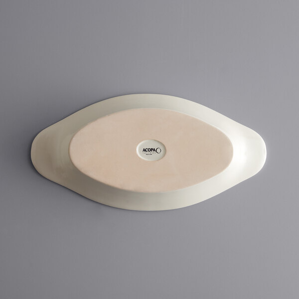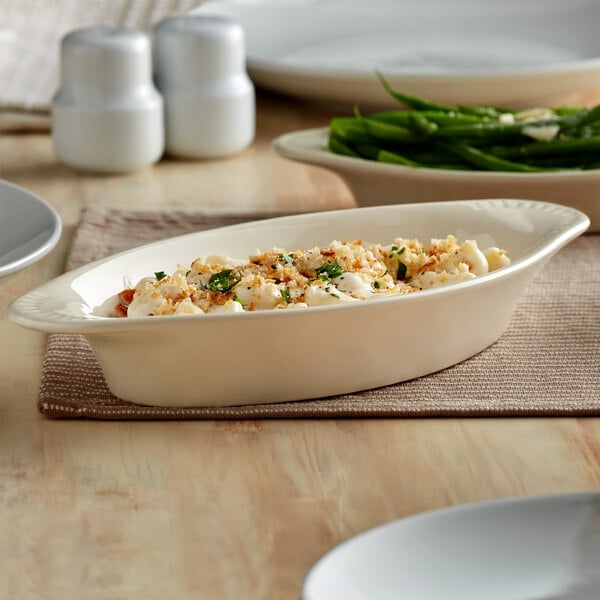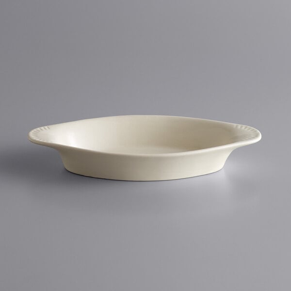 Acopa 15 oz. Ivory (American White) Oval Stoneware Rarebit is very durable and nice looking , we use them everyday in our microwave and conveyor oven.