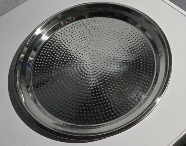 Looove this tray. Very shiny and sturdy. The hammered look is perfect and it doesnt just make the tray look good but it also helps the cups from sliding around it fits a decent amount of cups. Great for serving drinks or desserts to a small medium crowd. Will buy again in different sizes