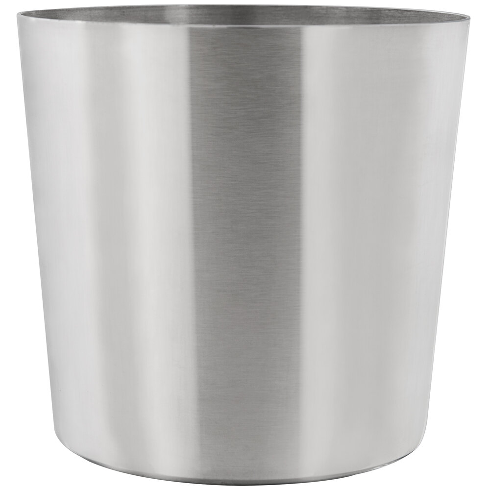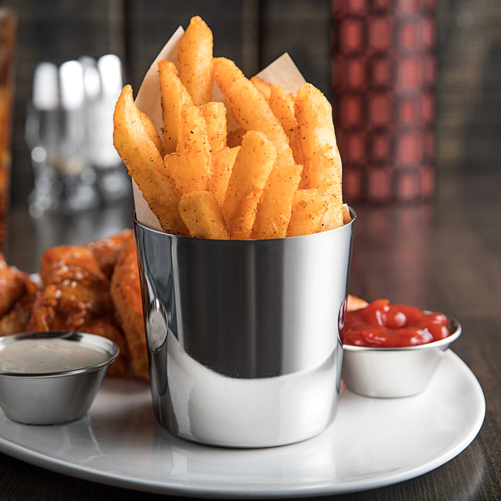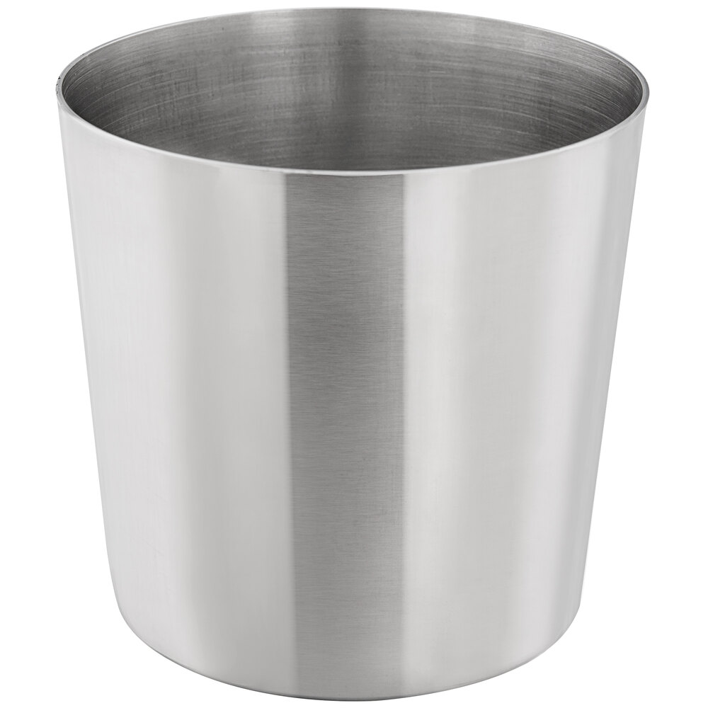 This french fry cup features a smooth stainless steel construction and provides a simple, clean presentation in your casual dining area.