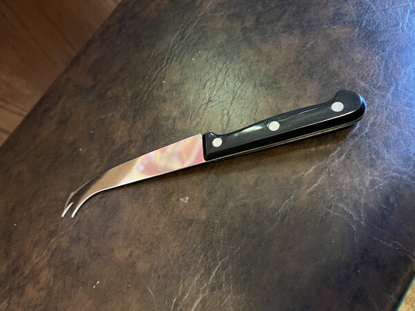 Great adorable set all include a full tang handle and a semi sharp blade. Cuts through hard cheese like Parmesan with ease and will satisfy your cheese knife needs